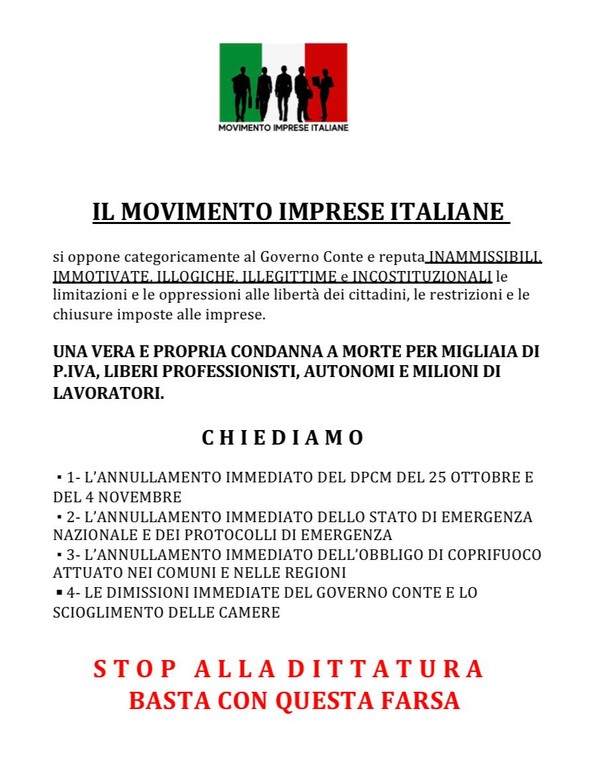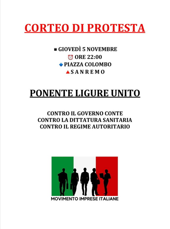 Il direttivo del Movimento Imprese Italiane invita tutte le imprese del ponente ligure ad unirsi e partecipare ad un corteo di pacifica protesta contro i DPCM del 25 ottobre e del 4 novembre 2020 emanati dal Governo Conte.