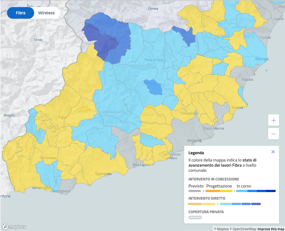 Notizie migliori per Mendatica, Cosio d'Arroscia, Montegrosso Pian Latte, Aurigo dove l'operatività è data per inizio 2021. Bisognerà aspettare un po' di più su Pieve di Teco, Ranzo, Pornassio, Vessalico, Rezzo, Borgomaro, dove si indica la metà dell'anno venturo. Diversa invece la tabella di marcia per la connessione via wireless che seguirà un iter più lungo.