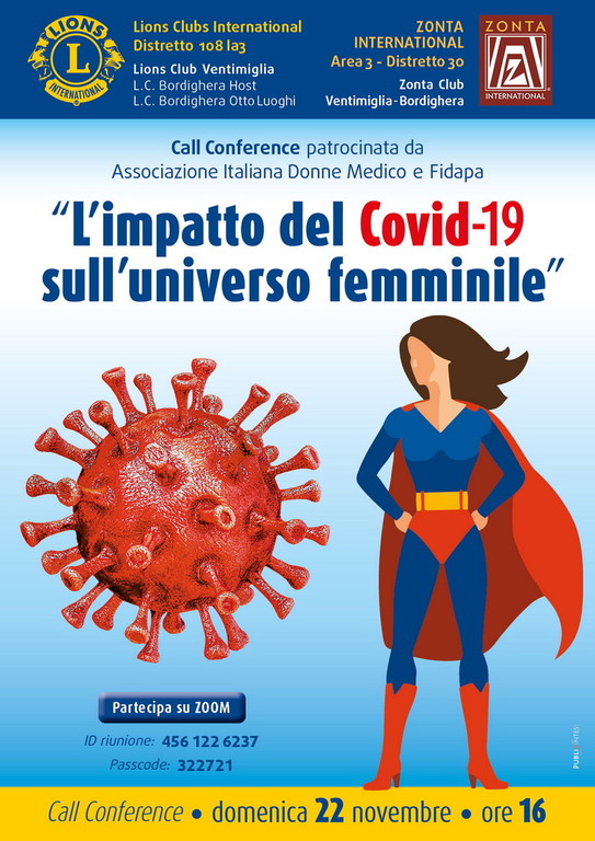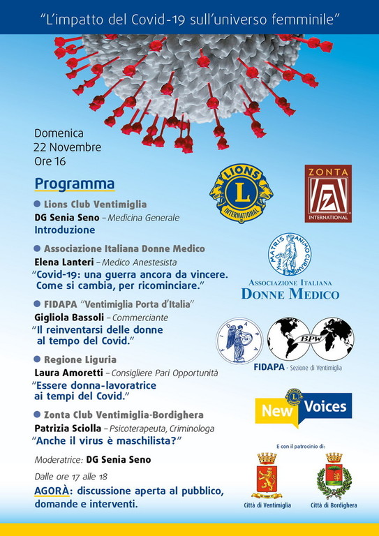 Domenica, dalle 16, il Lions Club Ventimiglia organizza un Convegno in videoconferenza dal titolo ‘L'impatto del coronavirus sull'universo femminile’.