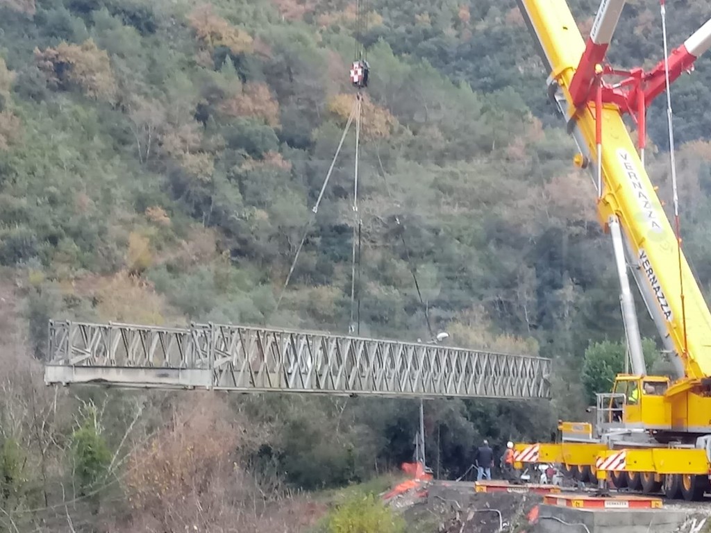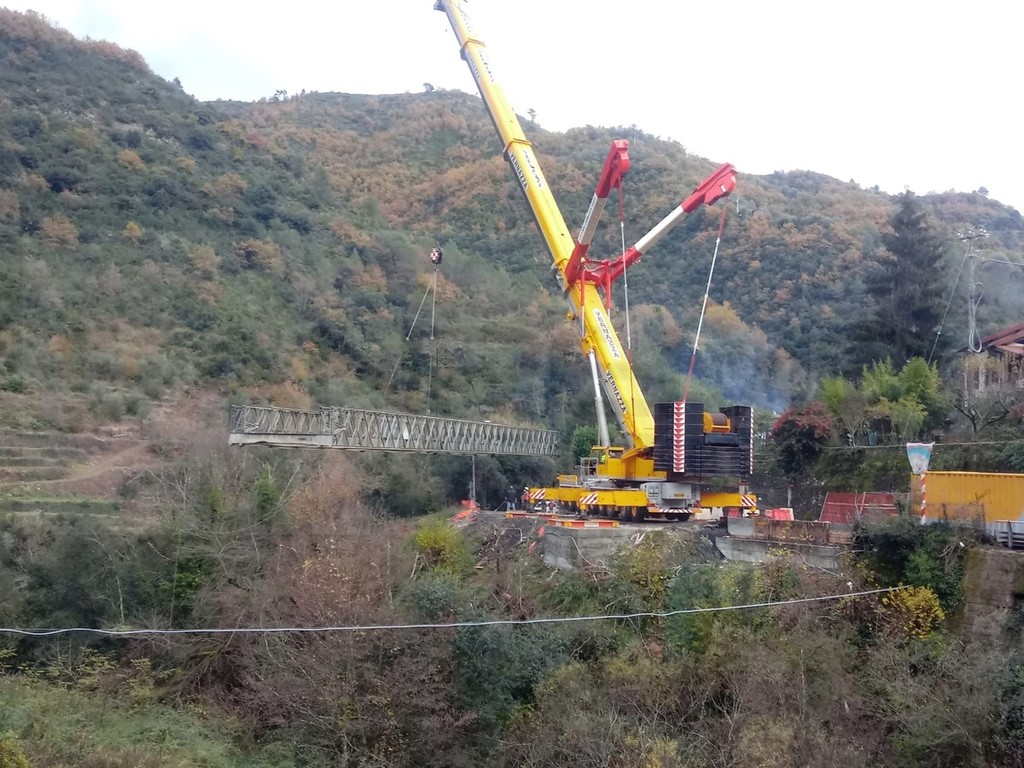 Dopo il lavoro di allestimento del mezzo, in tarda mattinata è stato imbragato il ponte e rimosso dalla sua sede. Ora il ponte verrà smontato e caricato sui camion per essere riportato alla ditta che lo aveva noleggiato.