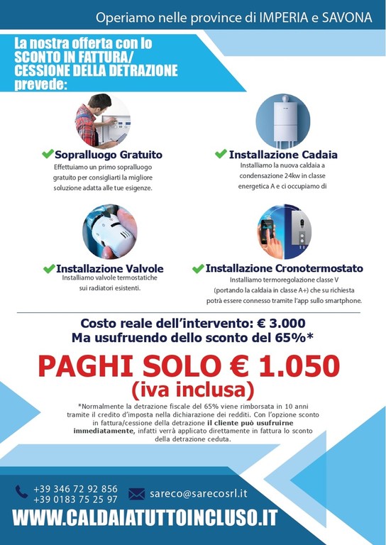 “La nostra offerta prevede una riqualificazione dell’impianto, portandolo in classe di efficienza energetica in classe A+, sostituendo la vecchia caldaia con un apparecchio di nuova generazione a condensazione, comprensivo di cronotermostato evoluto ed installazione di valvole termostatiche (fino a 3) sui radiatori esistenti al costo totale di 3.000 euro IVA compresa “chiavi in mano”. Grazie a questa agevolazione, il cliente pagherà effettivamente solo 1.050 euro (anziché 3.000 euro), in quanto la detrazione fiscale che gli spetterebbe (pari al 65%) verrà direttamente scontata in fattura. Ovviamente nel prezzo finale sono già compresi tutti gli adempimenti necessari per poter usufruire di tale incentivo”.