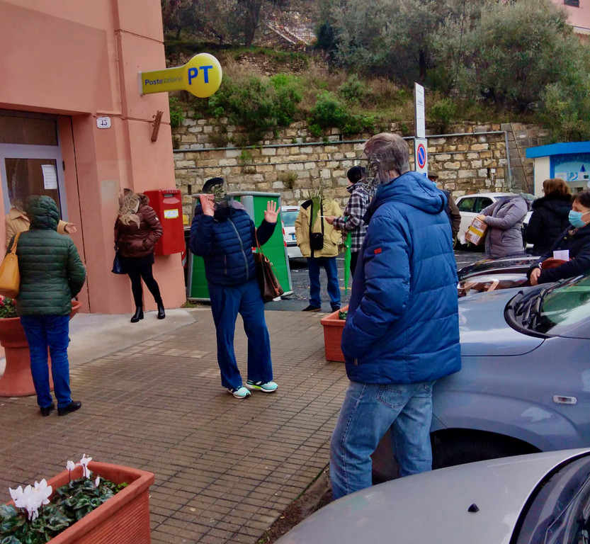 Molte, troppe persone davanti all’ufficio postale di Cipressa, nei soli tre giorni di apertura dello sportello, tanto che, a seguito del rischio assembramento, il sindaco Filippo Guasco ha chiesto nuovamente alle Poste di ripristinare l’apertura per sei giorni settimanali.