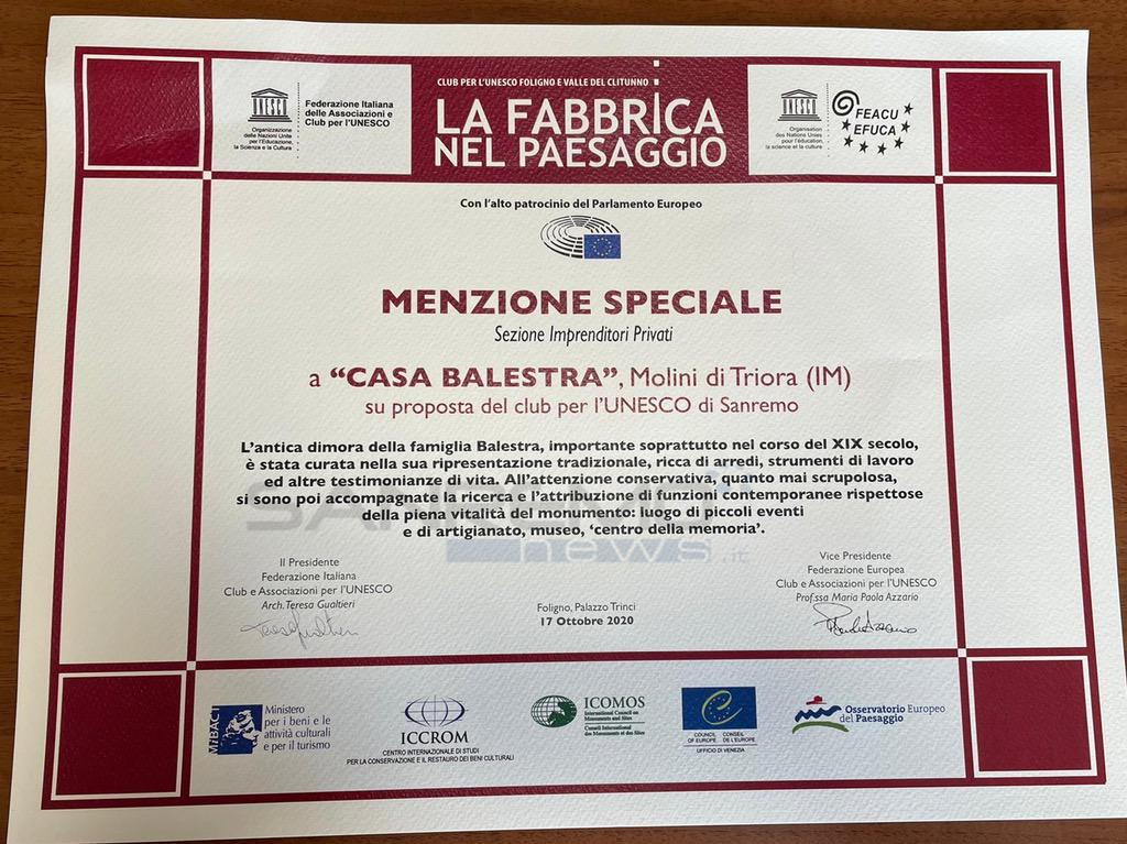 Il Club per l’UNESCO di Sanremo è orgoglioso di aver portato anche quest’anno una partecipazione a questo prestigioso concorso e nell'ambito della cerimonia ha ringraziato Daniela e Giacomo Lantrua per aver partecipato con grande entusiasmo per far conoscere una realtà che dà lustro al Comune di Molini di Triora. Il Sindaco, Manuela Sasso, ha sottolineato l’importanza del riconoscimento ricevuto da Casa Balestra anche in funzione della rilevanza storico – artistica dello stabile che bene si inserisce nel patrimonio culturale presente nel territorio comunale.