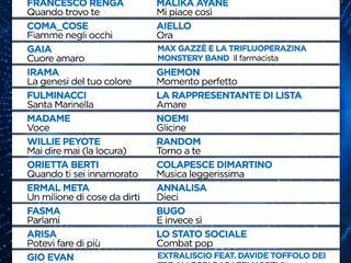 La serata di ‘Sanremo Giovani’ ha anche decretato la lista delle Nuove Proposte che vedono 6 cantanti scelti tra i selezionati Rai e due provenienti da Area Sanremo.