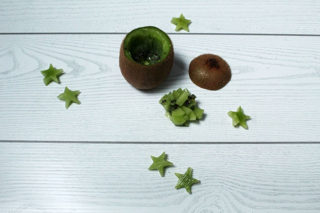Tagliate la calotta del kiwi e scavatelo con l’ausilio di un cucchiaino, tenendo da parte la polpa
