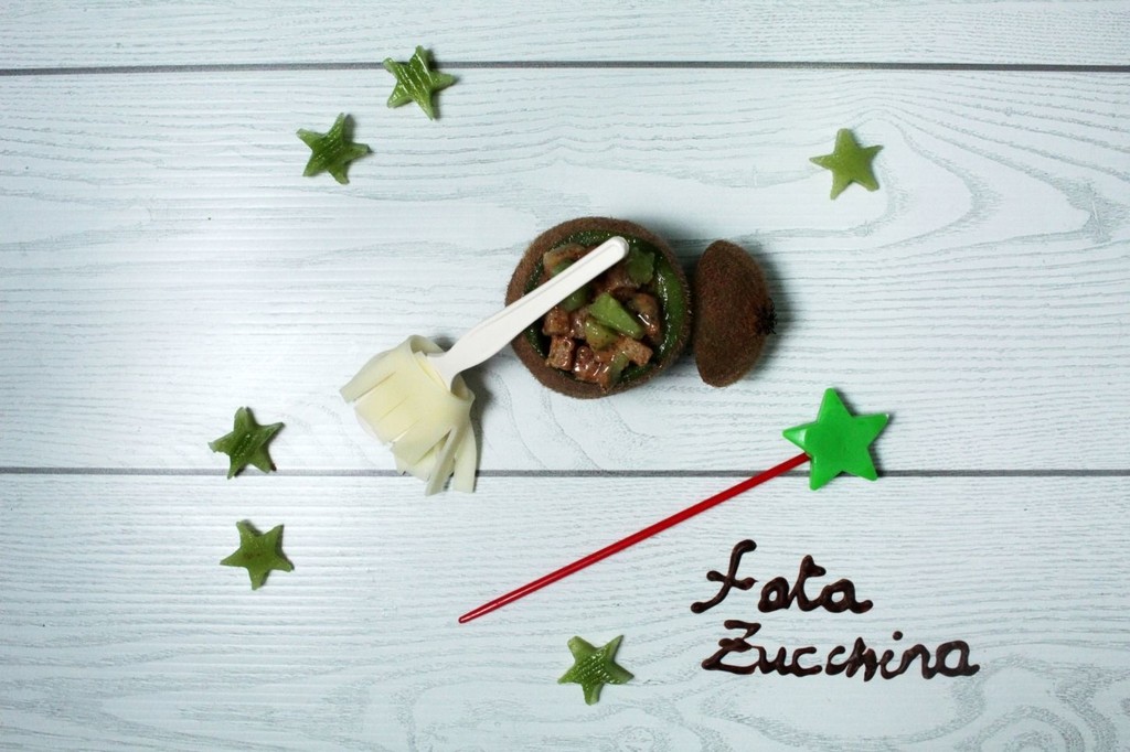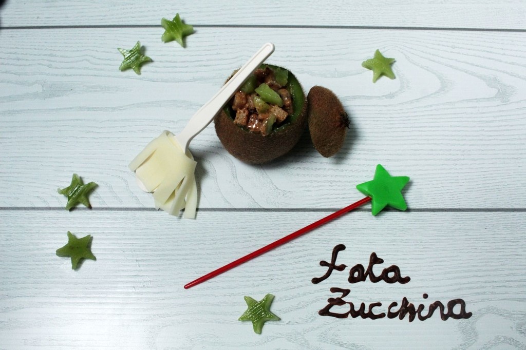 Con l’impasto dolce-salato ottenuto in precedenza, farcite il kiwi svuotato (come fosse un calderone), quindi immergete il cucchia-scopa per girare bene il tutto e degustare la pozione favolosa
