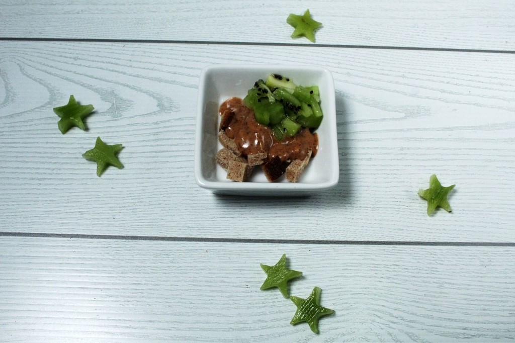 A parte, unite la polpa del kiwi alla crema di noci e ai tocchetti di pane