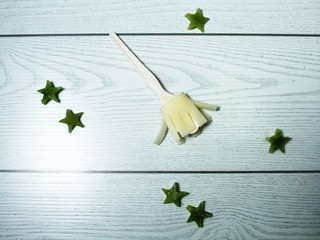 Modellate ogni cucchiaino a forma di scopa (per scacciare le preoccupazioni!) tagliando a metà le fette di formaggio, quindi formando delle frange sottili per ogni metà fetta