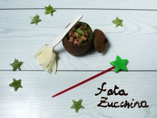 Con l’impasto dolce-salato ottenuto in precedenza, farcite il kiwi svuotato (come fosse un calderone), quindi immergete il cucchia-scopa per girare bene il tutto e degustare la pozione favolosa