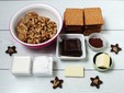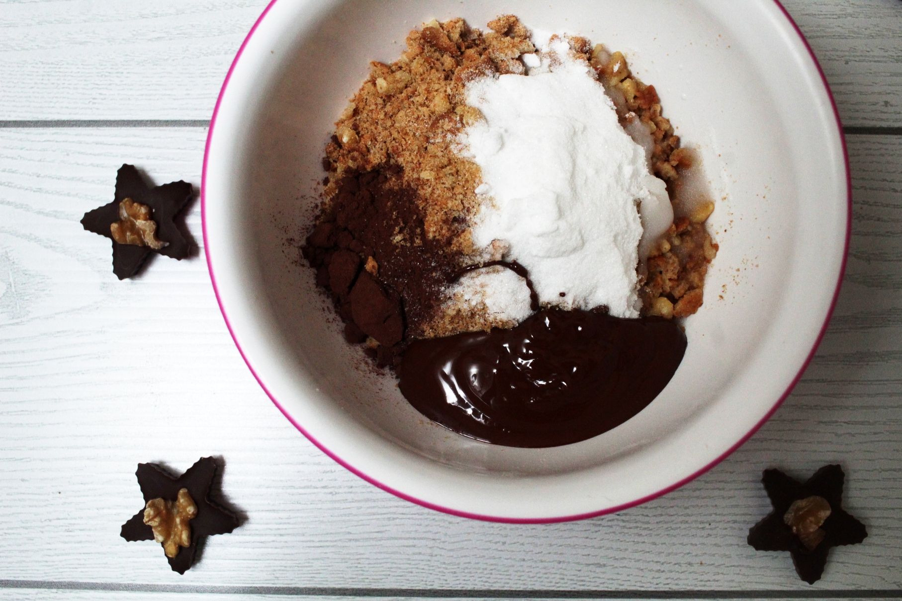 Unite il cioccolato fuso alla farina di biscotti e di noci, quindi addizionate il latte, il burro già fuso, il cacao in polvere, lo zucchero e il latte a temperatura ambiente