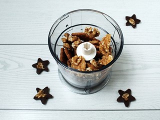 Tritate i biscotti secchi e le noci con l’aiuto di un frullatore