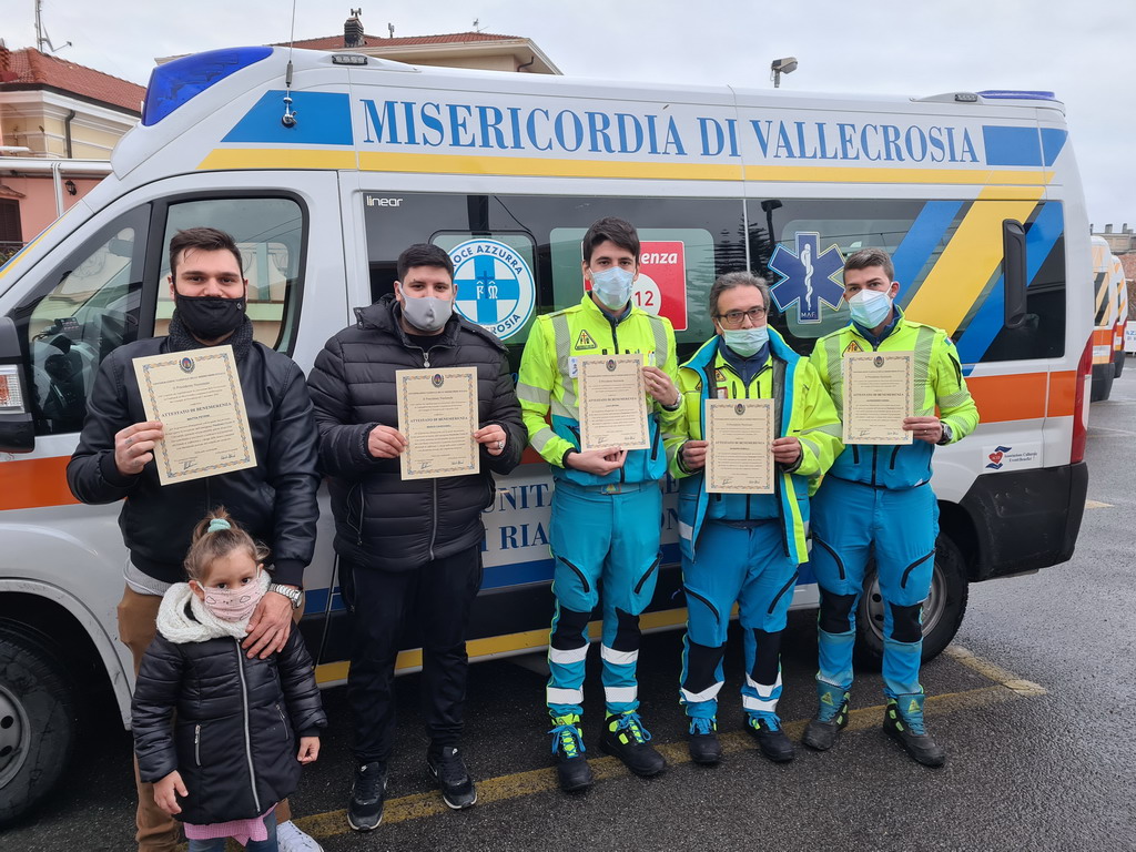 I premiati dalla Confederazione Nazionale delle Misericordie d’Italia sulla base dei capitoli che regolamentano la concessione delle benemerenze ai Confratelli di Misericordia ed in riferimento alla deliberazione del Consiglio di Presidenza del 5 Dicembre 2020 sono: Matteo Amato (Direttore); Massimo Amato, Giuseppe Alcamo, Andrea Biasi, Franco Cavaliere, Gianpiero Bomboi, Gabriele Deaddis, Alessandro Farina, Stefano Ricotta, Giuseppe Tramontana (Autisti Soccorritori Dipendenti); Massimiliano Biasi, Alessandro Biancheri, Marco Cavicchioli, Michael Cocco, Leonardo Genovese, Paolo Lamantea, Maurizio Nesetti, Patrick Parola, Mattia Perini, Massimo Ricotta, Emanuele Rinaldi, Luigi Russo, Silvano Sappraccone (Autisti Soccorritori Volontari); Valentina Barbaro ed Elisabetta Farina (Soccorritore Volontario); Giuseppe Domulo (Ausiliario Servizi Tecnici Dipendente); Francesco Esposito (Ausiliario Servizi Tecnici Volontario).