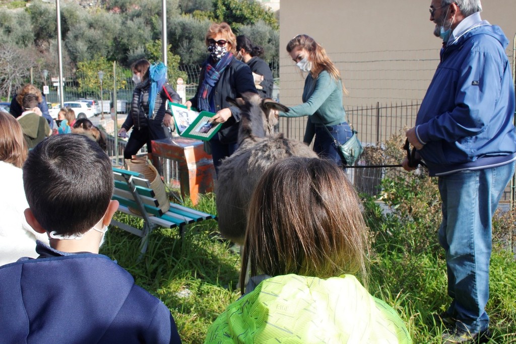 Pomeriggio di sorpresa e curiosità per i bambini della scuola primaria di Cervo. L’asinella Margherita dell’asineria del Ciapà, due pecore brigasche, un maialino addomesticato, una coppia di pappagalli e una serie di immagini sui lupi delle Alpi liguri, scattate dal fotografo Gabriele Cristiani, hanno popolato il giardino della scuola per farsi scoprire e conoscere. Obiettivo del colorato incontro, che si è svolto in sicurezza seguendo le norme anti covid, presentare il concorso, tutto dedicato ai più piccoli, attraverso il quale decretare il nome che sarà dato al cervo in arrivo nel borgo in primavera.