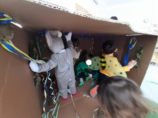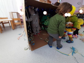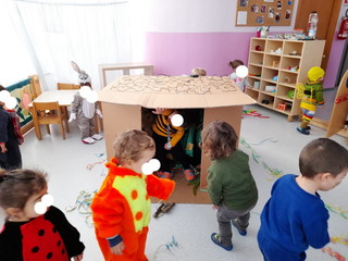 I bambini del Nido d’infanzia “Abbracciaperte" di San Bartolomeo al Mare quest'anno hanno festeggiato il Carnevale all'interno di una grossa "buca". Attraverso l’osservazione dell'interesse dei bambini per i buchi e le cavità scoperte nel giardino del Nido, le educatrici hanno rilanciato questa loro attenzione con proposte di ricerca e scoperta, immergendosi nell'esplorazione dei vari buchi, naturali o rintracciati in oggetti di uso casalingo. A questo lavoro, è stato affiancata la lettura del libro "Orso Buco". La trama ha così suggerito il tema della festa di Carnevale. Le educatrici hanno allestito un grosso scatolone capace di accogliere tutti i bimbi, a differenza del libro "Orso Buco", che si conclude con Elefante che non può accedere nella tana di Orso perché "non passa dal buco".