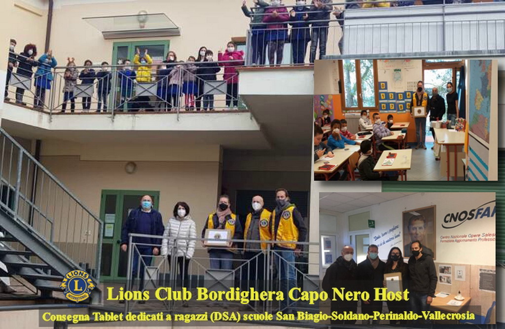 Il Lions Club Bordighera Capo Nero Host, in questi giorni ha concluso alcuni service umanitari e sociali. Su indicazione dell'assessore ai servizi sociali il Lions Club di Bordighera, ha provveduto a sostenere le spese di un mese di affitto, per una giovane mamma in reale difficoltà con due figli da crescere. A dicembre il Presidente Rodolfo Brizio del Bordighera Capo Nero Host, accompagnato dai soci Gianfranco Ravotti, Marco Zagni, hanno consegnato 4 dispositivi informatici appositamente dedicati a ragazzi affetti da disturbi specifici per l'apprendimento (DSA). I tablet sono stati consegnati alle scuole di San Biagio della Cima, Soldano, Perinaldo e Vallecrosia, dove erano presenti anche i Sindaci dei rispettivi comuni.