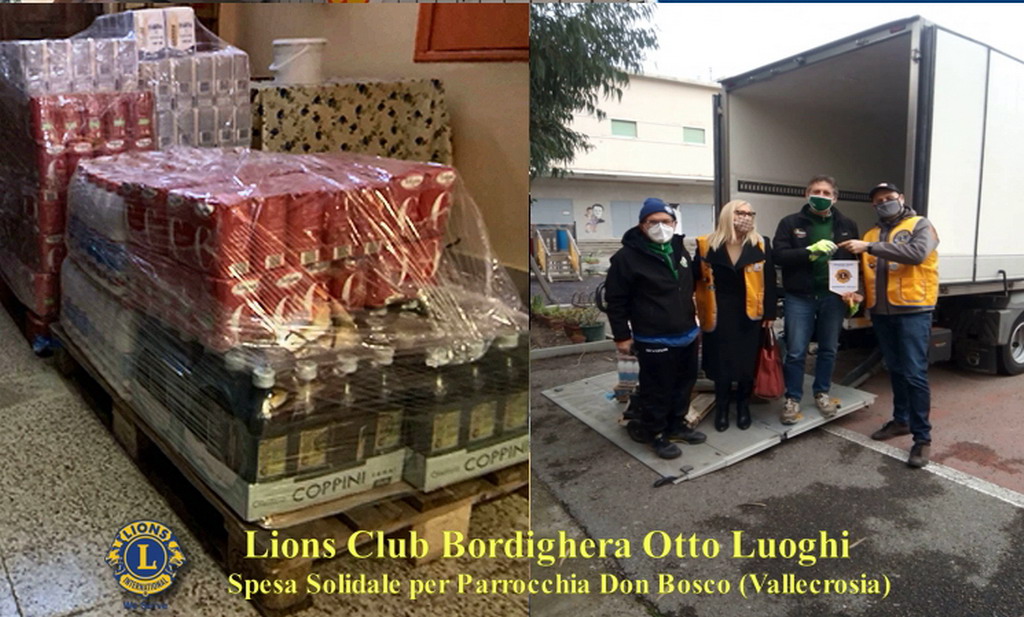 Anche il Lions Club Bordighera Otto Luoghi, guidato dal Presidente Germano Pellegrino con i soci Domenico Espugnato e Enzo Costagliola Di Polidoro, hanno donato sabato scorso alle opere parrocchiali Don Bosco di Vallecrosia, centinaia di generi alimentari di prima necessità: Zucchero 250 kg. Farina 200 kg. Pasta 100 kg. Olio 60 lt. Latte 120 lt. Tonno 150 kg.