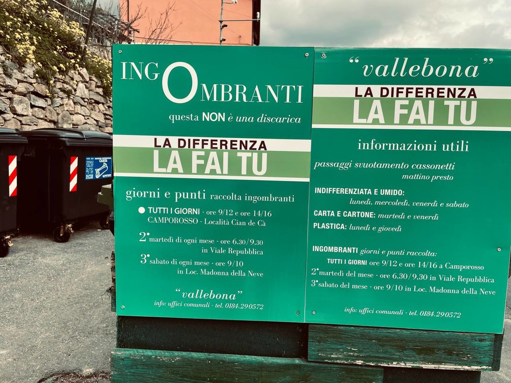 Per quel che riguarda gli ingombranti , è possibile portarli direttamente in discarica tutti i giorni a Camporosso, località Cian de Ca dalle ore 9/12 e 14/16; oppure in viale Repubblica il secondo martedì di ogni mese ore 6.30-9.30 e il terzo sabato di ogni mese ore 9-10 in loc. Madonna della Neve.