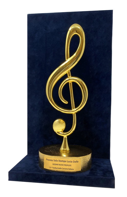 Il “Premio Sala Stampa Lucio Dalla” dedicato al cantautore bolognese, che consiste in una chiave di violino, verrà conferito alle due categorie, per la Sezione Campione e Sezione Nuove Proposte, dai giornalisti della Radio, del Web e della Tv. Con le sue creazioni da anni impreziosisce gli eventi di Casa Sanremo e Musica contro le Mafie. Nelle passate edizioni con le sue opere sono stati premiati artisti che hanno fatto la storia del Festival, ma anche giornalisti, autori e maestranze. Tutti coloro, insomma, che hanno raccontano e promuovono il Festival di Sanremo nel mondo, fondendo il tutto, in un rapporto che unisce la bellezza della musica a quella dell’arte orafa. Tra i tanti si ricorda, in particolare, l’opera che ha premiato la canzone più votata della storia della musica italiana, nella serata evento “Nata per Unire”, in occasione del 150° Anniversario dell’Unità d’Italia, assegnata ad Al Bano Carrisi con il “Va’ Pensiero” del Nabucco di Verdi. Opera, questa, presentata dai vertici Rai al Quirinale alla presenza del Capo dello Stato Giorgio Napolitano e destinata a restare negli annali della storia del Festival della Canzone Italiana.