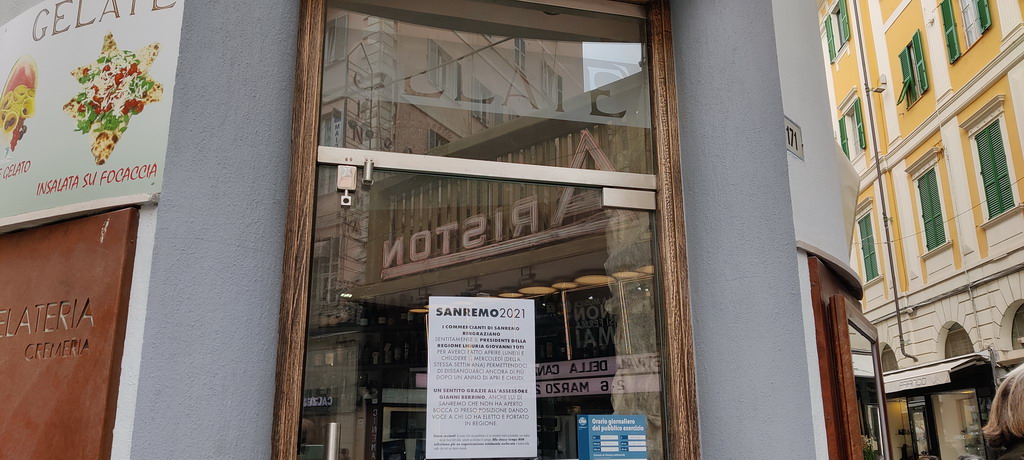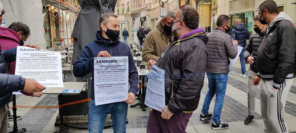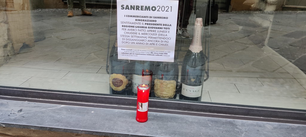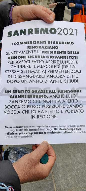 Da Regione qualche rassicurazione alle categorie ma questo non è bastato a molti imprenditori dei locali di Sanremo. In un manifesto mostrato durante la serrata si legge: "I commercianti di Sanremo ringraziano sentitamente il presidente della Regione Liguria, Giovanni Toti, per averci fatto aprire lunedì e chiudere il mercoledì della stessa settimana permettendoci di dissanguarci ancora di più dopo un anno di apri e chiudi".