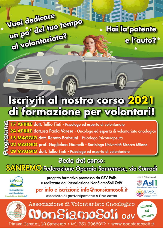 "Negli ultimi anni la richiesta d'aiuto è aumentata e nel 2020 i volontari hanno donato all’associazione 2000 ore di impegno, percorrendo oltre 20mila chilometri con le spese dei viaggi a carico dell'Associazione NonSiamoSoli odv di Sanremo. - affermano - Ora c’è bisogno di aumentare il numero dei volontari attivi e soprattutto di migliorare le loro conoscenze, in modo da poter offrire ai pazienti una qualità di servizio sempre migliore. Aspettiamo quindi le vostre adesioni donne e uomini, al nostro corso di formazione per volontari destinato a persone automunite, che abbiano disponibili tempo e volontà d'impegnarsi qualche ora la settimana, più siamo e più qualità offriamo".