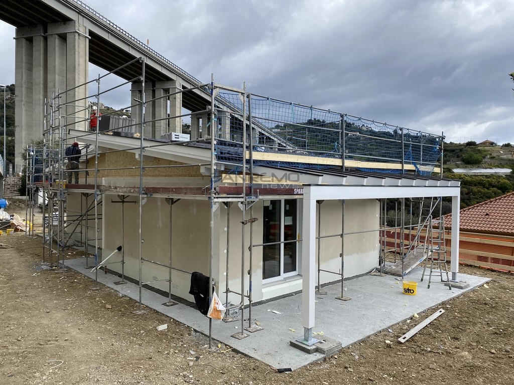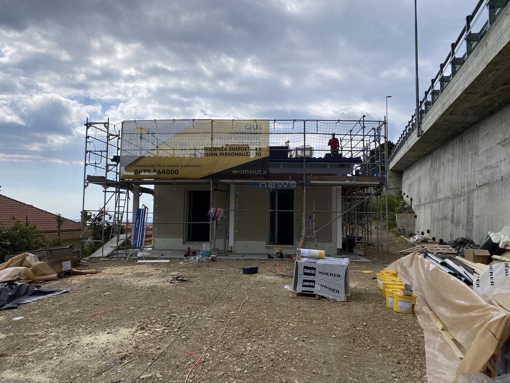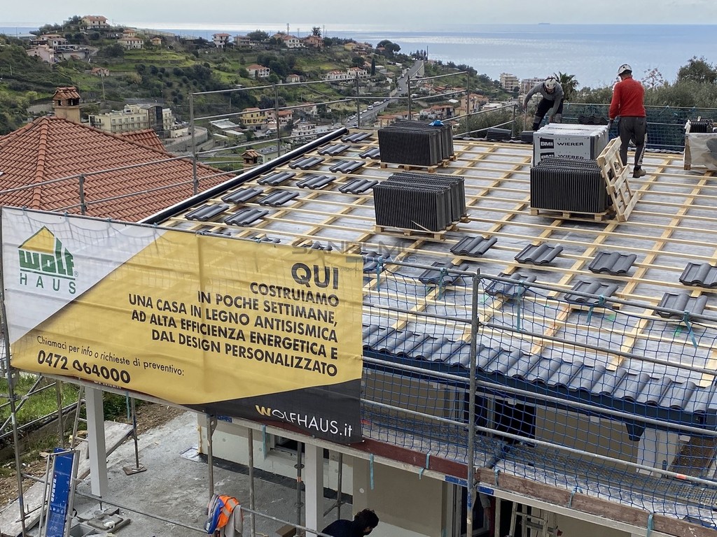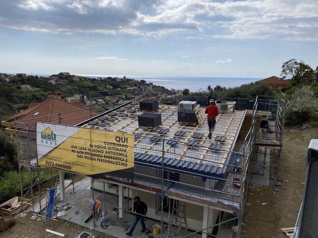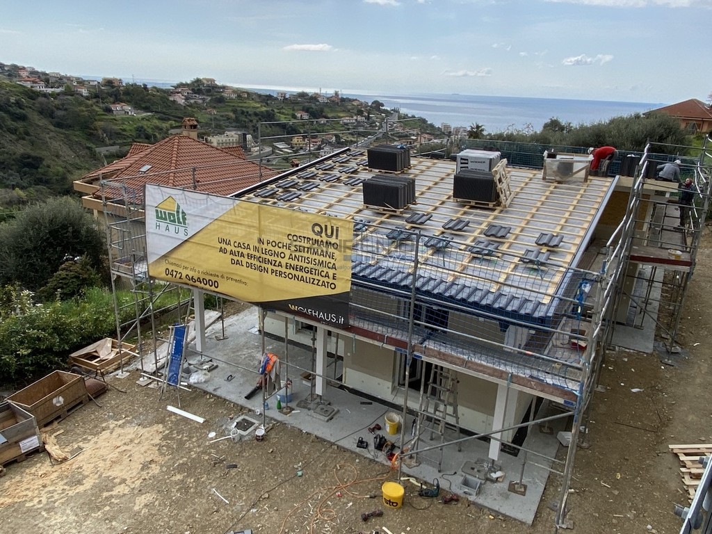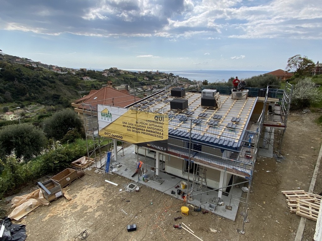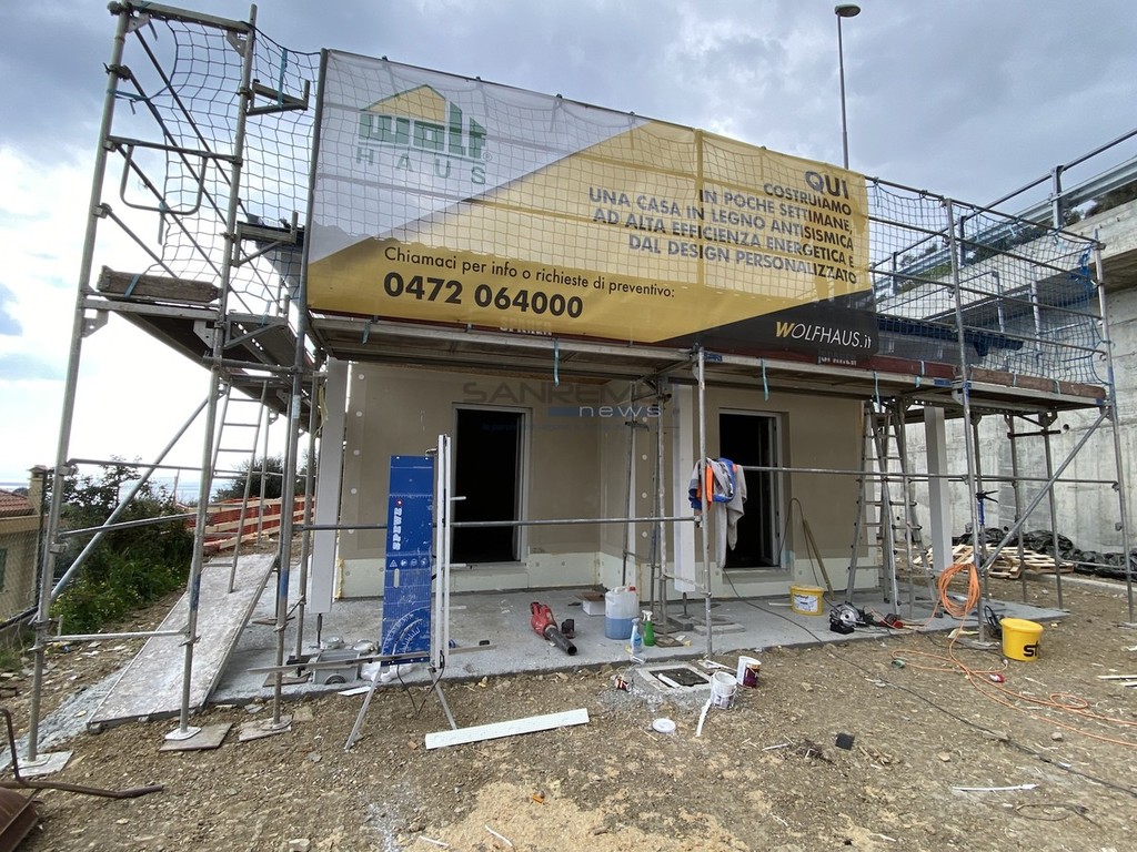 La parola d’ordine è una sola: velocità. Quella velocità tanto acclamata al tempo delle carte bollate si è manifestata nei primi mesi di quest’anno, trovando l’apice a metà marzo. Sembra incredibile, ma la struttura che vediamo in foto è stata costruita in circa 10 giorni. Il progetto firmato dall’architetto Francesca Formaggini dell’omonimo studio sanremese ha trovato compimento grazie a un’impresa altoatesina che realizza strutture su misura intelaiate in legno, soluzione che permette la costruzione dello ‘scheletro’ di una nuova casa in una manciata di giorni. Il risultato è sotto gli occhi di tutti e l’obiettivo finale (il cantiere è iniziato da zero a febbraio) è quello di consegnare le chiavi nel giro di quattro mesi circa.