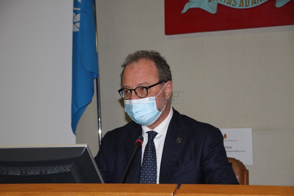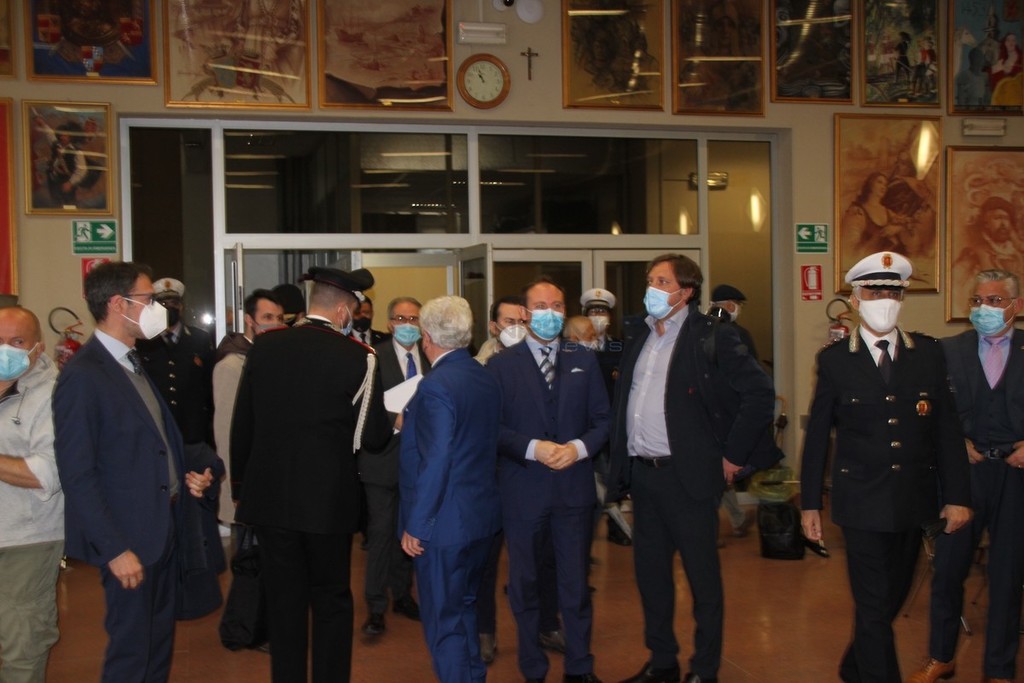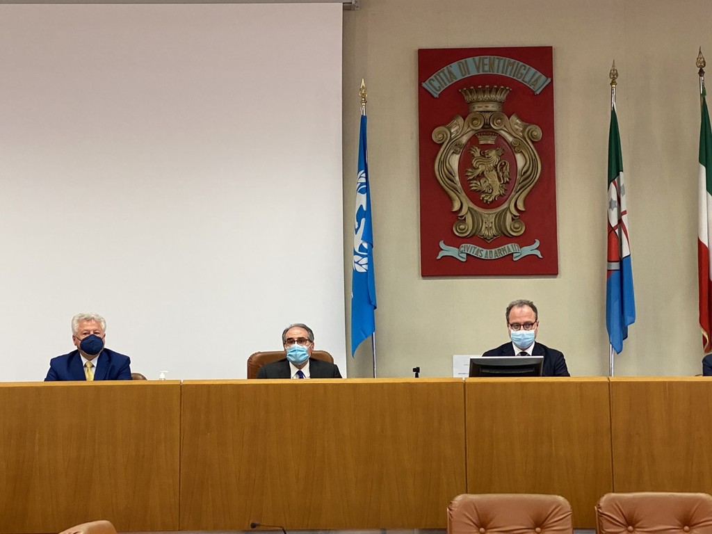 Dopo la prima stretta di mano con il sindaco Gaetano Scullino, il sottosegretario alla Difesa, Giorgio Mulè, ha incontrato la stampa nella sala consiliare del Comune di Ventimiglia alla presenza del Prefetto, Alberto Intini, dell'On. Flavio Di Muro, dell’amministrazione comunale e di molti rappresentanti di Forza Italia da tutta la Provincia oltre al sindaco di Bordighera, Vittorio Ingenito.