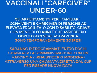 Inoltre sono temporaneamente sospesi gli appuntamenti di familiari conviventi e caregiver (di persone ultravulnerabili oppure con disabilità grave), con meno di 60 anni che avrebbero dovuto ricevere il vaccino Vaxzevria (Astrazeneca). I loro appuntamenti saranno riprogrammati entro pochi giorni per la somministrazione di un vaccino Pfizer o Moderna (vaccini a mRNA), attraverso una chiamata diretta dal Cup per fissare la nuova data.