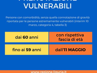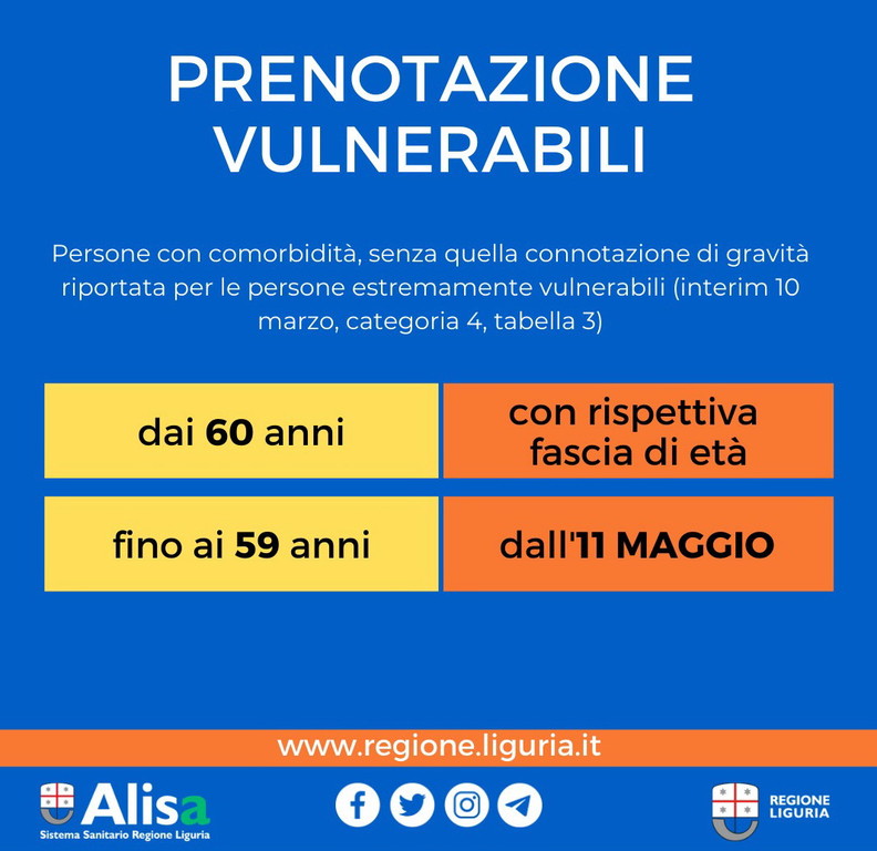I ‘vulnerabili’ over 60 possono prenotare il vaccino con la rispettiva fascia di età; i ‘vulnerabili’ under 60 potranno prenotare il vaccino a partire dall’11 maggio attraverso il portale dedicato http://prenotovaccino.regione.liguria.it.