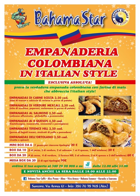I sapori della Colombia sono sbarcati al Bahama Star di Valle Armea. Lo staff del locale vi aspetta per farvi conoscere le “Empanadas”, cibo di strada molto popolare a Bogotà e non solo. Si tratta di una sorta di piadine di mais piegate a metà, farcite con carne speziata di pollo, di manzo o di maiale, di pesce e patate, che poi vengono fritte.