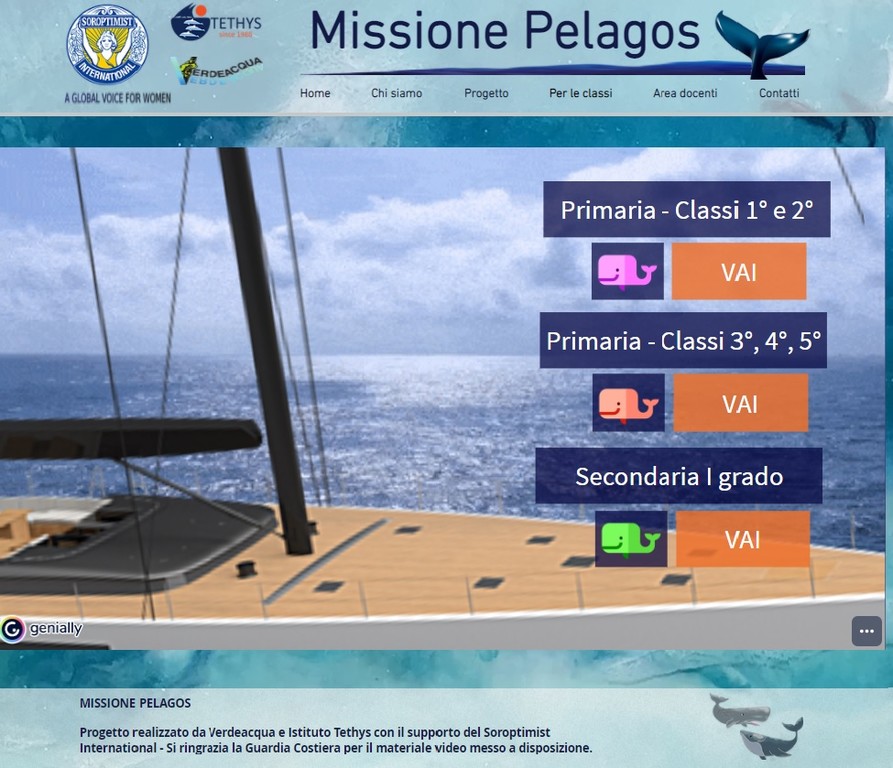 Missione Pelagos conterrà tre diverse sezioni per gli alunni, differenziate per fasce di età, e una dedicata alla formazione degli Insegnanti. In una prima fase, avviata in questi giorni, la versione pilota del progetto sarà messa a disposizione di quattordici scuole prescelte dai Soroptimist Club, mentre l’impiego della piattaforma completa sarà proposto a tutti i Comuni interessati alla sua diffusione nelle scuole del territorio, all’inizio del nuovo anno scolastico 2021- 2022.
