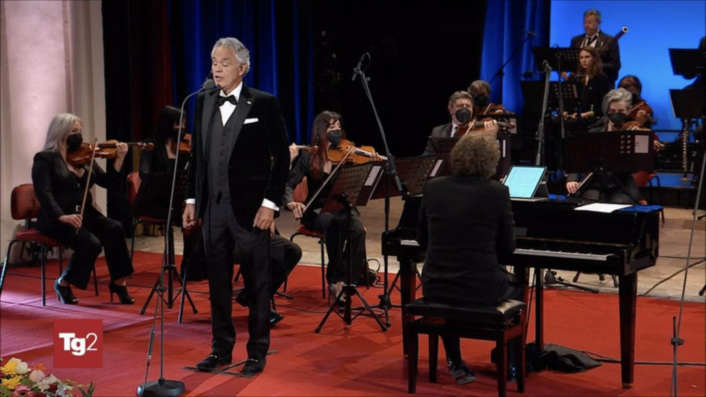 Dopo il benvenuto con un messaggio registrato del presidente della Regione Liguria, Giovanni Toti, è stato il momento dell’ambasciatore Dror Eydar che ha portato il proprio saluto dopo due giorni di visite in zona. Dal teatro dell’opera del casinò si è esibito il soprano Chen Reiss in “Yerushalaim Shel Zahav” seguito poi dai messaggi del Presidente della Camera, Maria Elisabetta Casellati, e del Primo Ministro israeliano Benjamin Netanyahu. Poi la tanto attesa esibizione di Andrea Bocelli con “You'll never walk alone”.