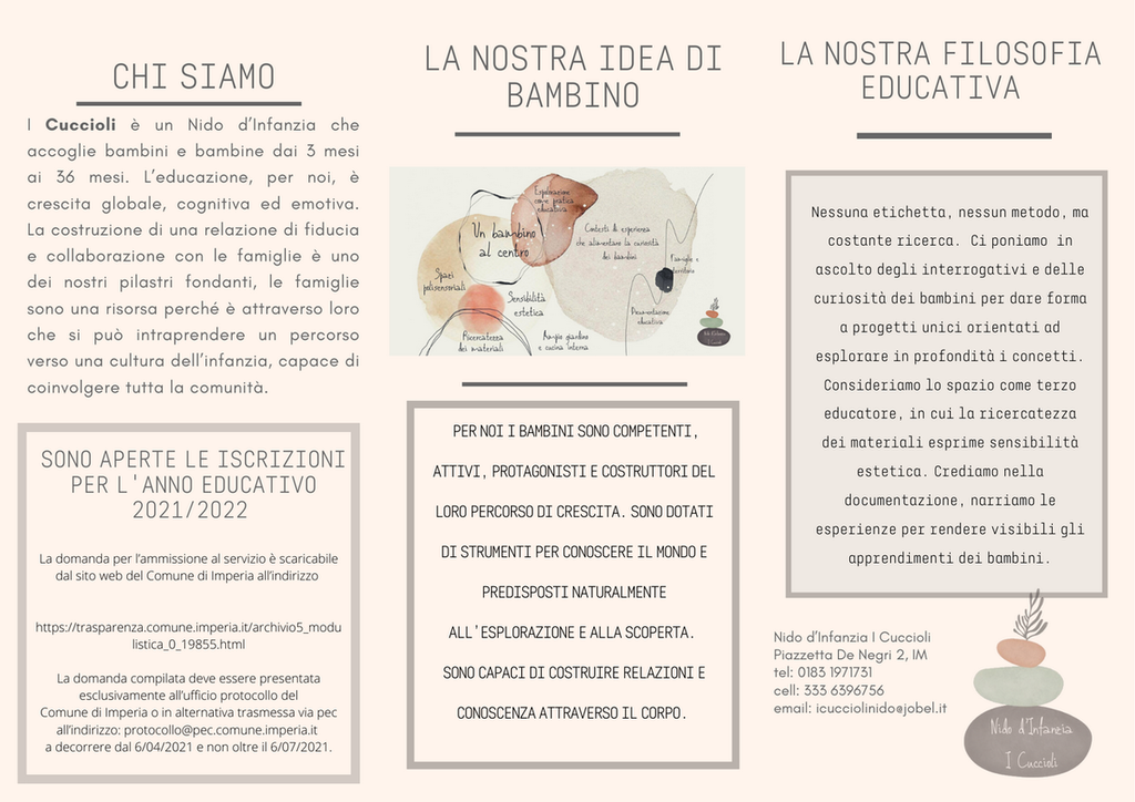Con anticipo rispetto al precedente anno educativo, il Nido d’Infanzia Comunale 'I Cuccioli' - da settembre 2019 affidato in concessione alla Cooperativa Sociale Jobel - apre le iscrizioni per l’anno educativo 2021/2022. È possibile presentare la domanda di iscrizione fino al 6 luglio 2021, utilizzando unicamente i moduli predisposti dal Settore Servizi Sociali, Prima Infanzia, Attività Educative e Scolastiche del Comune di Imperia scaricabili dal Sito Web del Comune di Imperia all’indirizzo http://www.comune.imperia.it - Sezione amministrazione trasparente.