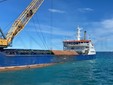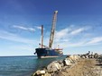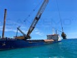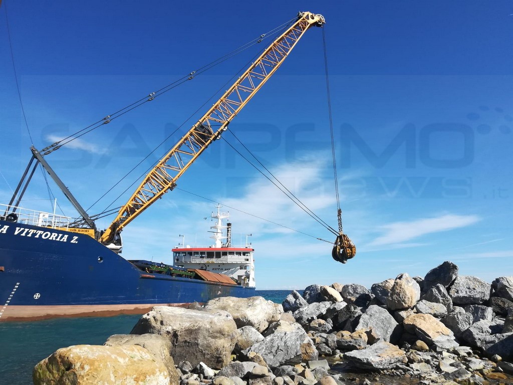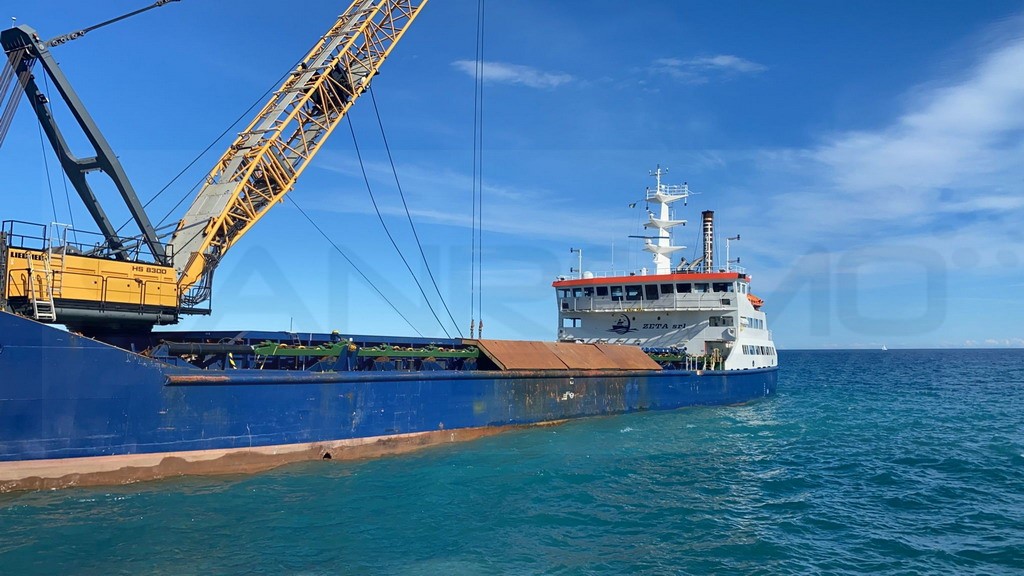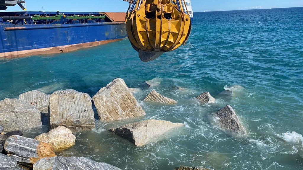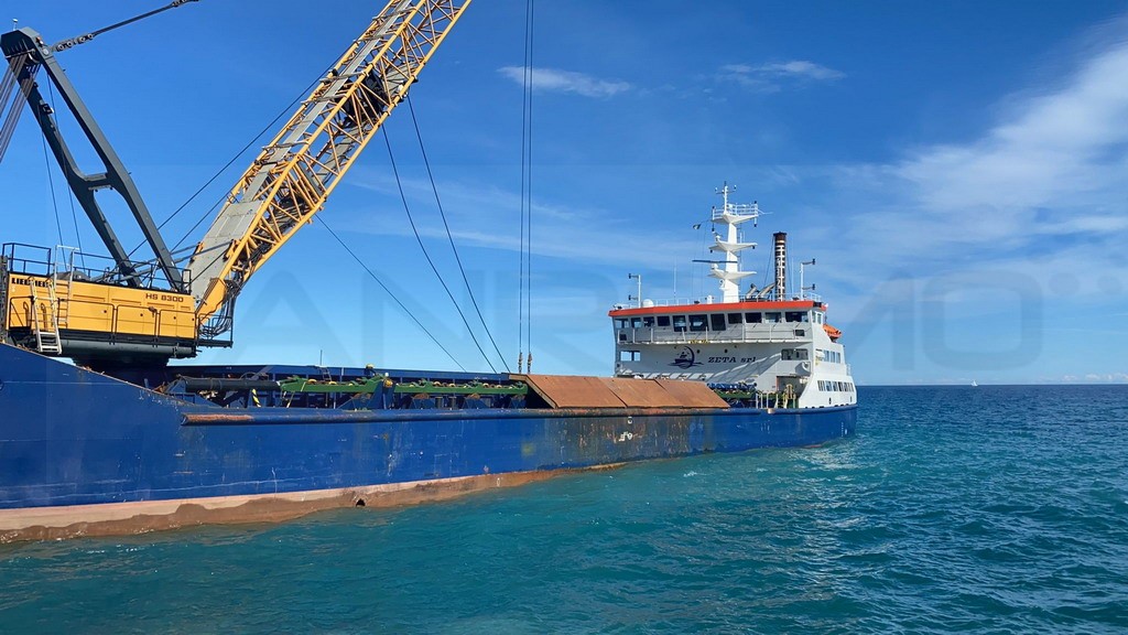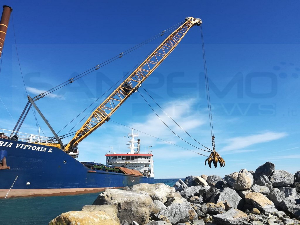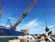 Anche una nave apposita arrivata dalla Sardegna, oggi a Pian di Poma per le operazioni di ripascimento delle spiagge. L’imbarcazione, grazie alla gru che ha a bordo, ha posato una serie di massi che serviranno alla scogliera e alla costruzione del molo.