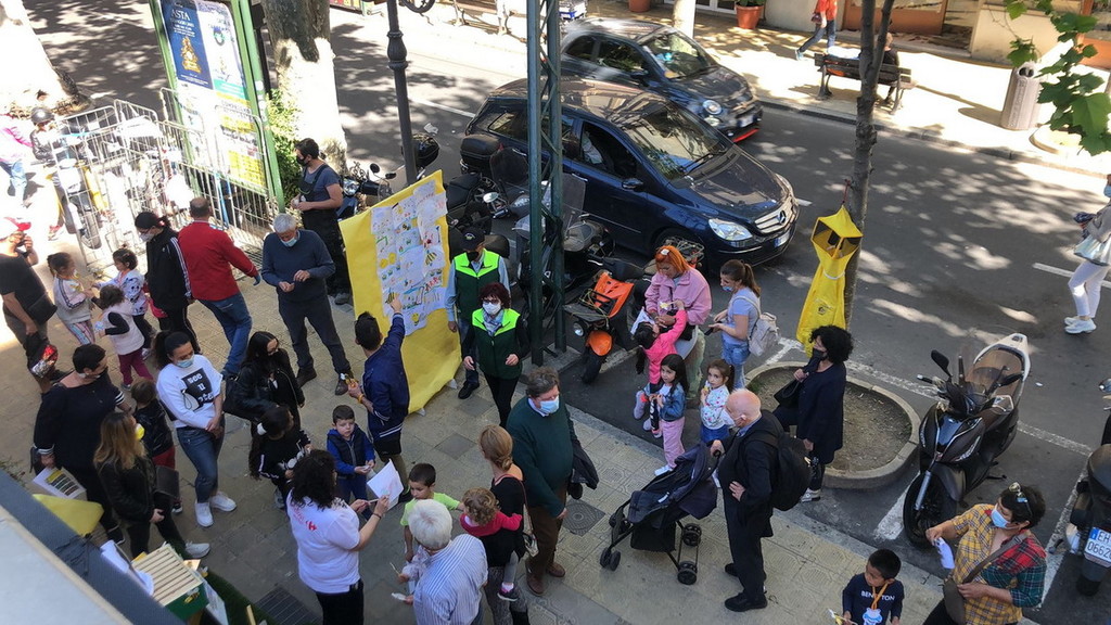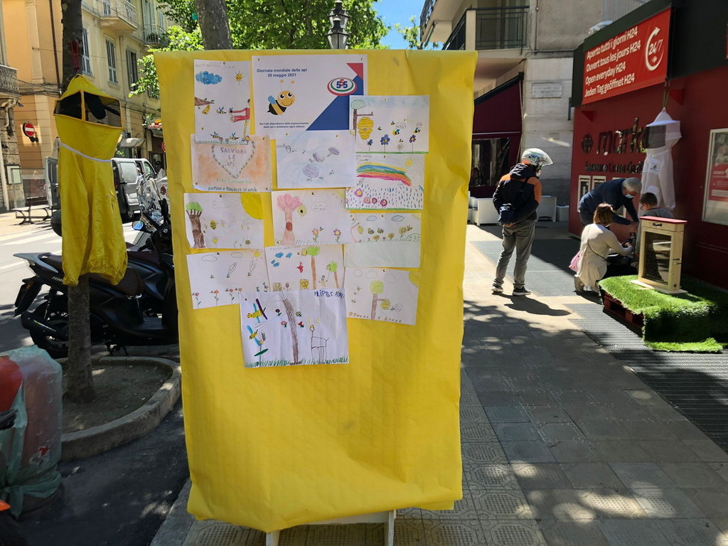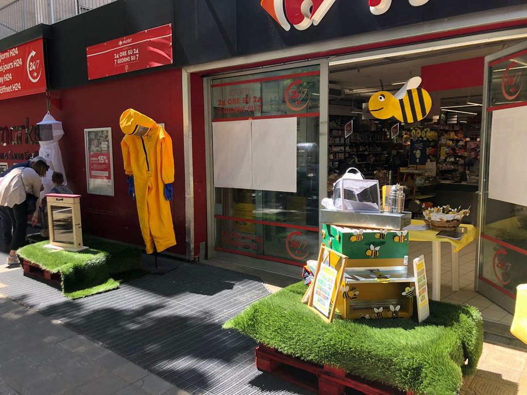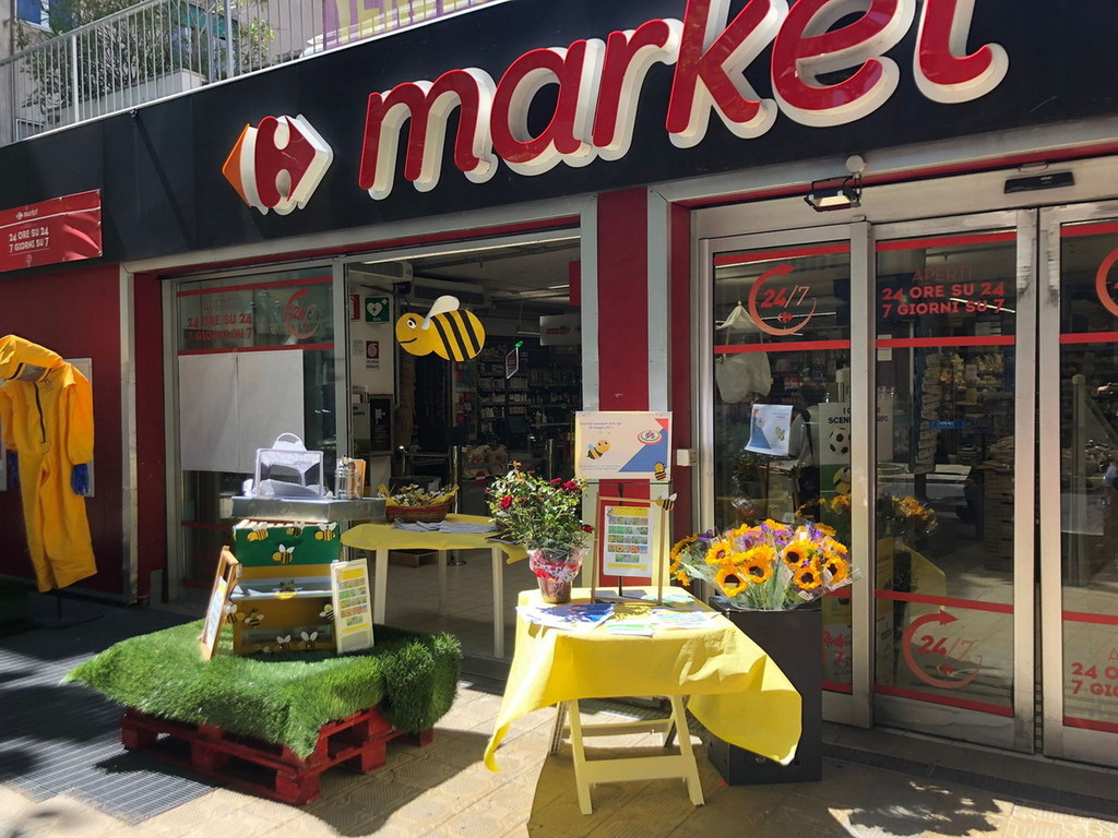 A far visita al banchetto in favore delle api, I bambini delle scuole di Villa Vico, Guadalupe e Via Volta di Sanremo, che con i loro genitori, sono andati per ammirare dal vivo le api, la loro casa e le loro abitudini e a raccogliere informazioni sui rischi che le api corrono nel mondo; bambini che per far sentire la loro vicinanza al tema, hanno esposto i loro disegni nel Market ricevendo come ringraziamento delle piccole apette fatte dai dipendenti del Carrefour e dei semi di girasoli, fiori amati dalle api, da piantare una volta tornati a casa.