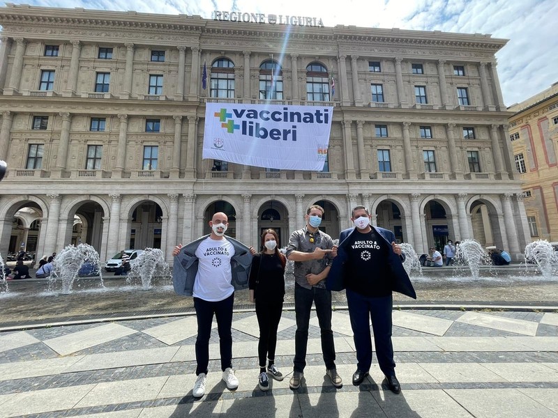 Prende il via oggi a Genova, nella giornata della Festa della Repubblica che celebra la rinascita e la libertà del Paese, la campagna ‘Vaccinati e Liberi’ per la ripartenza in sicurezza della Liguria, accompagnata dalle magliette 'Adulto e vaccinato', ideate da tre ragazzi genovesi durante la pandemia e indossate dal presidente della Regione Giovanni Toti e dal testimonial dell’iniziativa Matteo Bassetti, direttore della Clinica di Malattie Infettive dell’Ospedale Policlinico San Martino. Sulla facciata del palazzo di Piazza De Ferrari è stato srotolato uno striscione con scritto ‘Vaccinati e Liberi’ che rimarrà esposto fino al 7 giugno. Obiettivo dell’iniziativa, sensibilizzare i cittadini, soprattutto quelli ancora scettici, sull’importanza della vaccinazione per sconfiggere definitivamente il Covid-19.