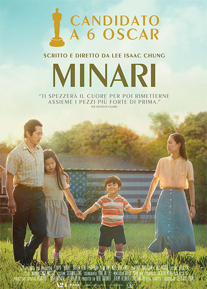 - MINARI – ore 21.00 – di Lee Isaac Chung – con Steven Yeun, Ye-ri Han, Yuh Jung Youn, Alan S. Kim, Noel Cho, Will Patton - Drammatico - "Tutto ha inizio quando Jacob, immigrato coreano, trascina la sua famiglia dalla California all'Arkansas, deciso a ritagliarsi la dura indipendenza di una vita da agricoltore negli Stati Uniti degli anni '80. Sebbene Jacob veda l'Arkansas come una terra ricca di opportunità, il resto della sua famiglia è sconvolto da questo imprevisto trasferimento in un fazzoletto di terra nell'isolata regione dell'Ozark. L'arrivo dalla Corea della nonna, donna imprevedibile e singolare, stravolgerà ulteriormente la loro vita. I suoi modi bizzarri accenderanno la curiosità del nipotino David e accompagneranno la famiglia in un percorso di riscoperta dell'amore che li unisce…”