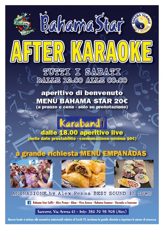C'è voglia di estate e spensieratezza al Bahama Star di Valle Armea. Il titolare Alex Penna ha pensato di intrattenere i suoi ospiti ogni sabato con una maratona di buona musica, divertimento e ottimo cibo. L'iniziativa che prende il nome di ''After Karaoke' prevede di far trascorrere ai presenti una giornata all'insegna del divertimento a 360°, con due servizi, pranzo e cena, l'aperitivo delle 18 ed un menù a soli 20 euro, compreso quello a base di “Empanadas”.