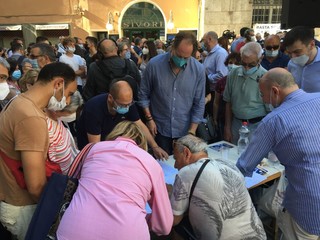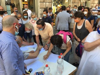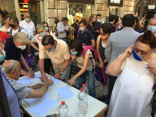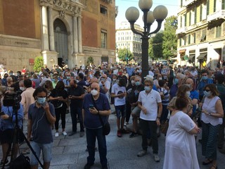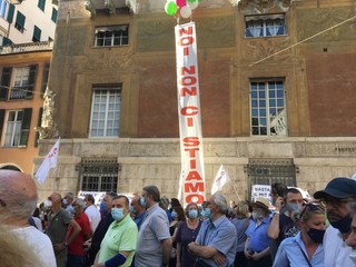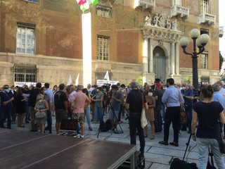 Numerosi politici, cittadini comuni e i parenti delle vittime del crollo del Morandi presenti davanti alla Prefettura del capoluogo contrari al pagamento di 9,5 miliardi per terminare la concessione in vigore