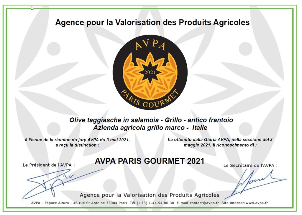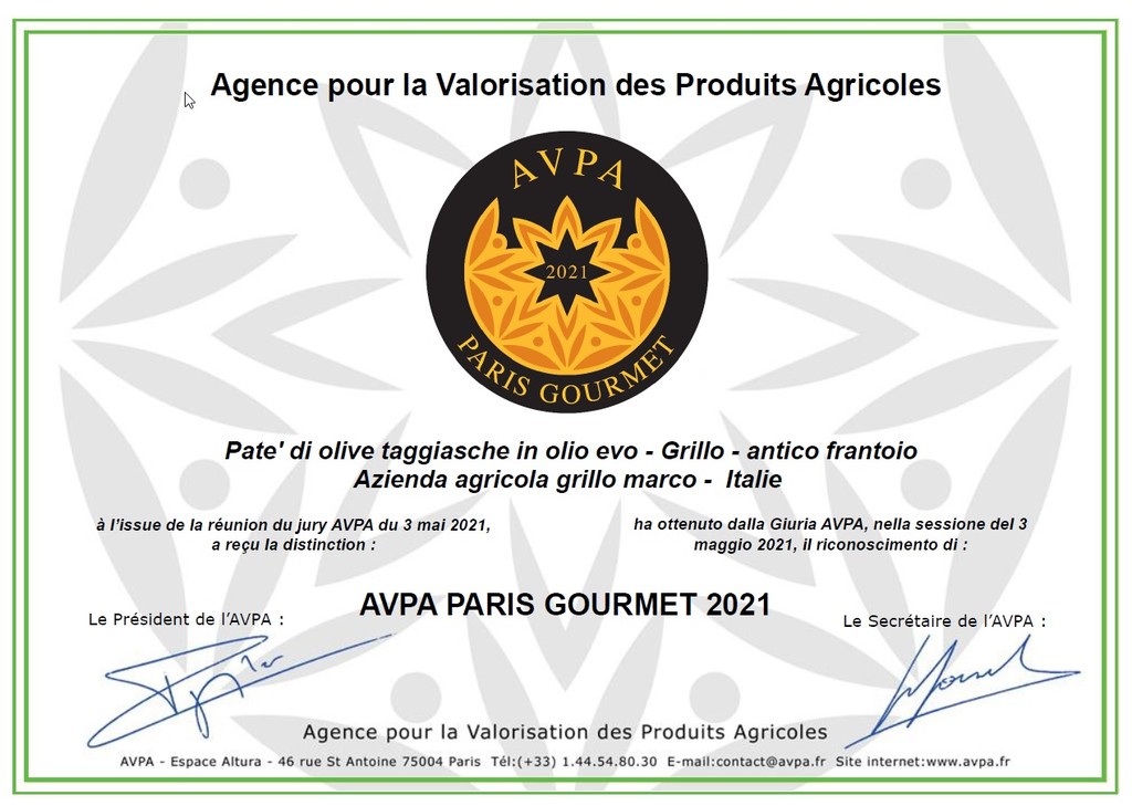 “Siamo orgogliosi di questo importante riconoscimento - dichiara Marco Grillo titolare del Frantoio - tre nostri prodotti di punta della nostra azienda si sono aggiudicati il prestigioso premio e confermano la nostra presenza fra i migliori produttori al mondo. Nel mondo della gastronomia i nostri prodotti si distinguono per la finezza del gusto e per la loro capacità di abbinamento elegante con i piatti delle cucine più raffinate. La medaglia AVPA rappresenta a livello internazionale un giudizio di grande eccellenza per la nostra produzione, ed è una garanzia in più per i nostri clienti. La valutazione di un collegio di esperti gastronomi e cuochi, permette ai nostri prodotti di fregiarsi del titolo di prodotti Gourmet, in quanto rispettano tutti i criteri di selezione: sono distinguibili dalla produzione ordinaria per l’originalità del gusto, della ricetta e/o aspetto; inoltre presentano una delicatezza e una persistenza in bocca, che ne fanno un prodotto memorabile; sono prodotti con ingredienti tracciabili e si presentano in una confezione commerciale che ne mantiene la freschezza, fornendo al tempo stesso informazioni corrette al consumatore”