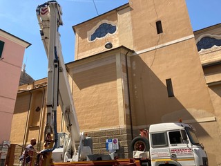 Imperia, cadono calcinacci dal campanile di San Giovanni, area messa in sicurezza: il danno "provocato" dai piccioni (foto)