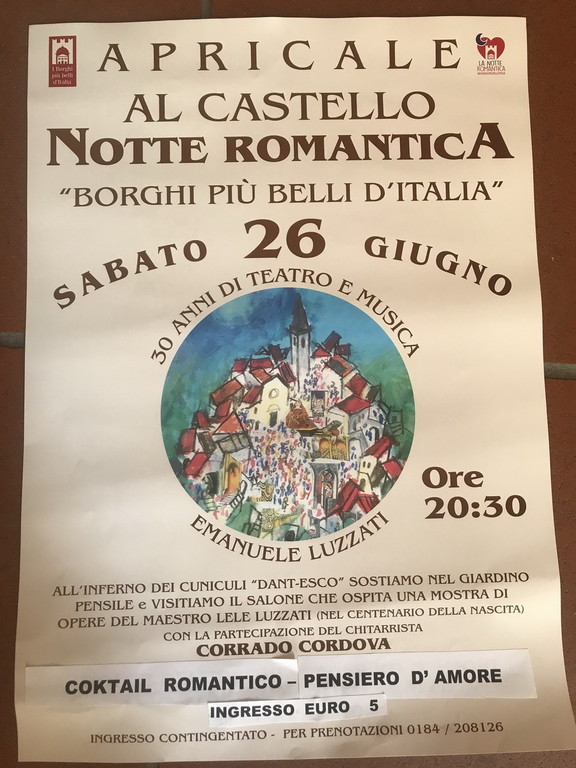 Nell’ambito della Notte Romantica dei Borghi più belli d’Italia, sabato 26 giugno seppur in concomitanza con la partita di calcio dell‘Italia, Apricale organizza una serata che prevede essenzialmente una visita al castello, attraverso i suoi cuniculi, Coktail Romantico all’interno del giardino pensile e visita al salone che ospita le opere del maestro Emanuele Luzzati nei Cento anni dalla sua nascita, sarà presente il chitarrista Corrado Cordovar. Appuntamento alle ore 20.30 al Castello (ingresso 5 euro).