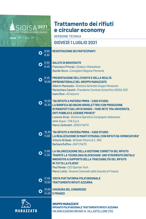 E’ in corso a Torino, dal 29 Giugno al 2 Luglio 2021, l’XI ‘Simposio Internazionale di Ingegneria Ambientale SIDISA’ promosso dall'Associazione Nazionale di Ingegneria Sanitaria Ambientale (ANDIS) e dal Gruppo Italiano di Ingegneria Sanitaria Ambientale (GITISA) in collaborazione con il Politecnico di Torino e partners Gold quali ‘Gruppo Smat’ e ‘Gruppo Marazzato’ per progetti di Ricerca & Sviluppo anche in tema di gestione dei rifiuti speciali.