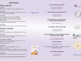 - incontro dal titolo “La lavanda della Riviera dei Fiori: tipologie e loro uso” a cura di Cesare Bollani, coordinatore del progetto “Lavanda Riviera dei Fiori”. I partecipanti all’incontro riceveranno in omaggio un sacchettino con i biscotti “Rundi alla lavanda” offerti dal rinomato biscottificio Gibelli di Vallecrosia.