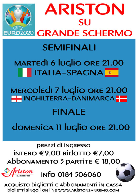 Così, come domenica 11 luglio, alle 21, si potrà assistere alla finale degli Europei. "Prezzo del biglietto intero 9 euro, ridotto 7 euro. Disponibile anche la formula del mini abbonamento alle 3 partite a 18 euro, acquistabile solo in cassa. I biglietti singoli sono acquistabili alla cassa del Teatro Ariston da oppure on line www.aristonsanremo.com" - ricordano dal Teatro Ariston di Sanremo.
