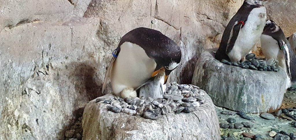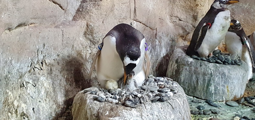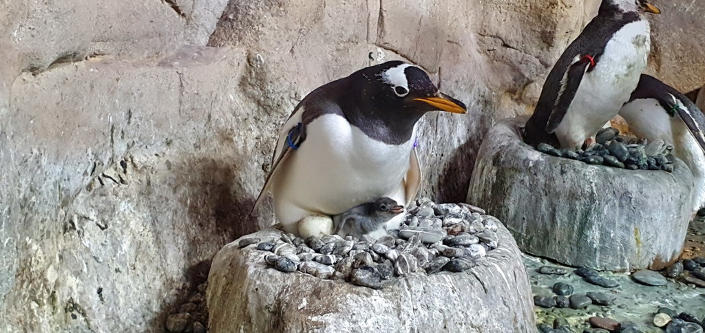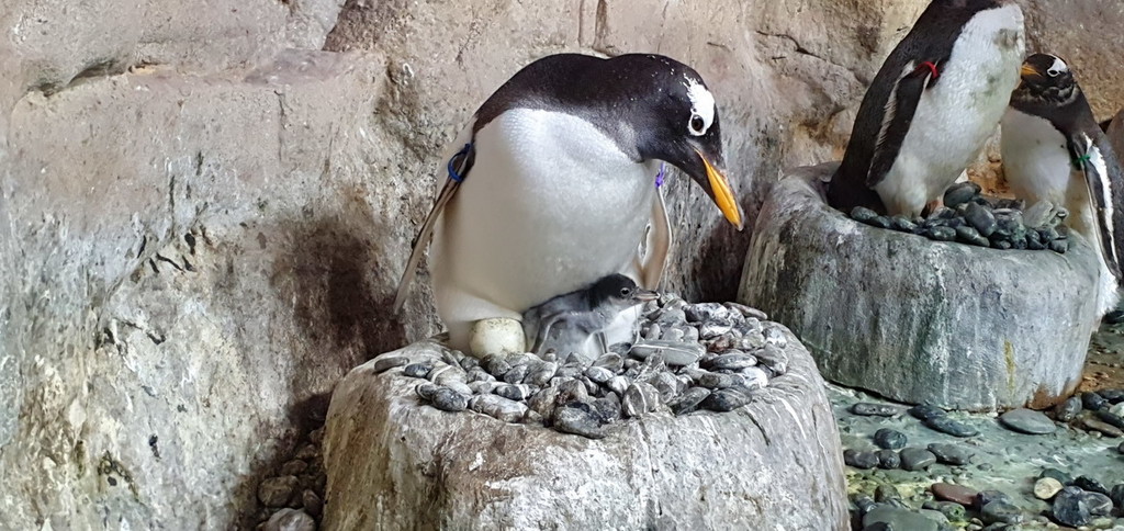Il piccolo è nato il 2 luglio da un uovo deposto il 24 maggio nel nido di ciottoli fatto da papà Kowalski e mamma Rosi, una pinguini nata nel 2006. L’uovo è stato covato alternativamente dai genitori che provvedono ora a nutrire il piccolo rigurgitando direttamente nel suo becco alimenti pre-digeriti. Kowalski, alla sua prima esperienza da genitore, e la mamma non abbandonano mai il nido contemporaneamente e sono molto attenti a proteggere il pulcino. Il piccolo è visibile dal pubblico nel suo nido, all’interno della vasca dei pinguini, tra le zampe dei genitori che si alternano a sfamarlo. Per poterlo nutrire, mamma e papà mangiano una quantità di cibo 2-3 volte maggiore rispetto alla dieta normale. Crescendo, il piccolo sarà sempre più visibile, pur rimanendo nel nido sotto l’attenta sorveglianza dei genitori. Il piccolo raggiungerà lo svezzamento intorno agli 80-90 giorni di vita, mentre intorno ai due mesi e mezzo farà la prima muta, passando dal piumaggio grigio alle piume impermeabili che gli consentiranno l’ingresso in acqua. Per conoscere il sesso, è necessario aspettare quel momento e prelevare una piuma per effettuare il test del Dna.