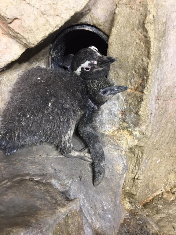 I piccoli pinguini - uno nato dalla coppia 'Giallo' e 'Verde-Nera' e due nati da una cova 'gemellare' di 'Verde' e 'Blu-Nera' - sono nati a metà giugno da uova deposte nei nidi ad inizio maggio. Anche per i pinguini di Magellano i genitori covano le uova alternativamente per tutto il tempo dalla deposizione alla schiusa. Sia mamma che papà provvedono ora a nutrire i pulcini rigurgitando alimenti predigeriti direttamente nel becco. Mamma e papà non abbandonano mail il nido contemporaneamente.