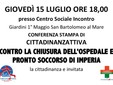 Si svolgerà giovedì alle 18 a San Bartolomeo al Mare, presso i giardini 'Primo Maggio' del centro sociale comunale 'Incontro", la conferenza stampa indetta da Cittadinanza Attiva sul tema dell'ospedale unico e del futuro assetto delle strutture sanitarie in provincia di Imperia: al centro dell'iniziativa gli studi portati avanti dall'associazione contraria all'ospedale unico negli ultimi due anni che individuano il golfo dianese come l'area più colpita dai futuri disservizi, oltre alla presentazione dei nuovi rappresentanti territoriali.