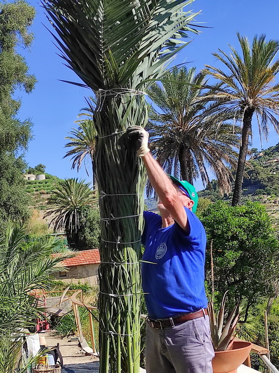 Noi, a livello dimostrativo abbiamo legato una palma del nostro vivaio (che dodici anni fa avevamo pensato quale simpatica provocazione culturale) seminata e piantata in terra due anni dopo la semina.