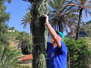 Noi, a livello dimostrativo abbiamo legato una palma del nostro vivaio (che dodici anni fa avevamo pensato quale simpatica provocazione culturale) seminata e piantata in terra due anni dopo la semina.