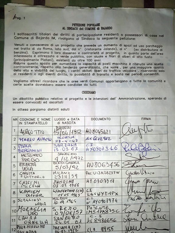 Dal Sindaco Francesco Laura viene confermato che, al momento, non è arrivato nulla in Comune “Aspetto con ansia. Se tutti i problemi di Bajardo riguardano un’aiuola che funge da water per tutti i cani del paese, povera la nostra Bajardo. Sarebbe anche utile sapere quanti veri residenti hanno firmato la petizione”.